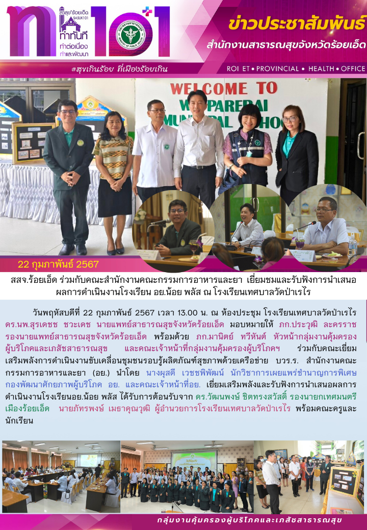 สสจ.ร้อยเอ็ด ร่วมกับคณะสำนักงานคณะกรรมการอาหารและยา เยี่ยมชมและรับฟังการนำเสนอ ผลการดำเนินงานโรงเรียน อย.น้อย พลัส ณ โรงเรียนเทศบาลวัดป่าเรไร